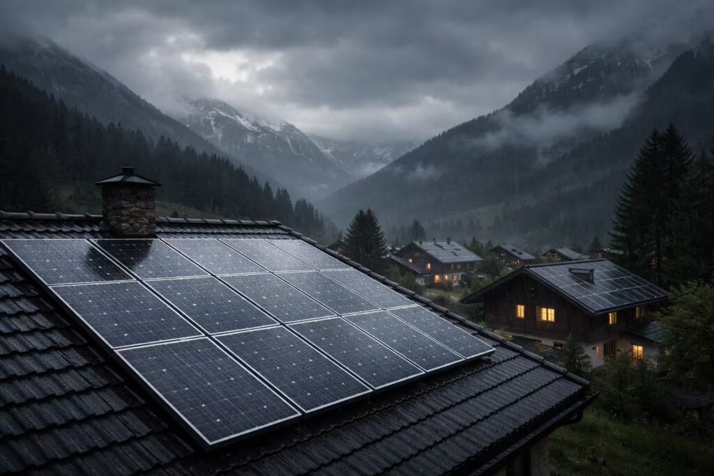 Les installations solaires sur les toits ne devraient plus être construites. Les panneaux solaires devraient être inclinés d’au moins 60 degrés. Un ensoleillement plus direct en hiver compenserait en partie la brièveté des journées et les situations de brouillard, tandis que la production serait plus faible en été.